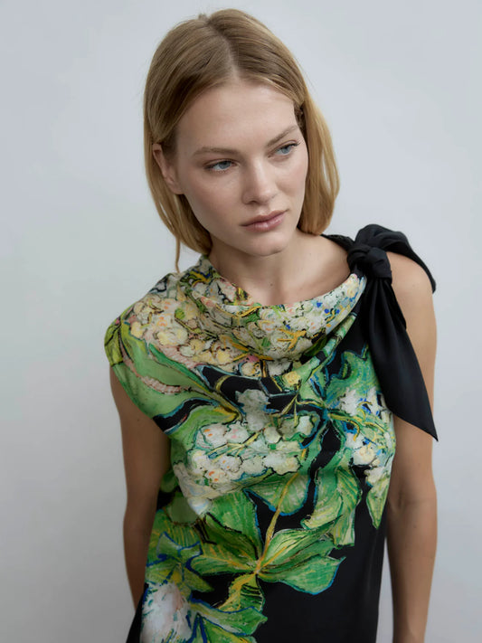 Hydrangea Brush One-Shoulder Knot Silk Top